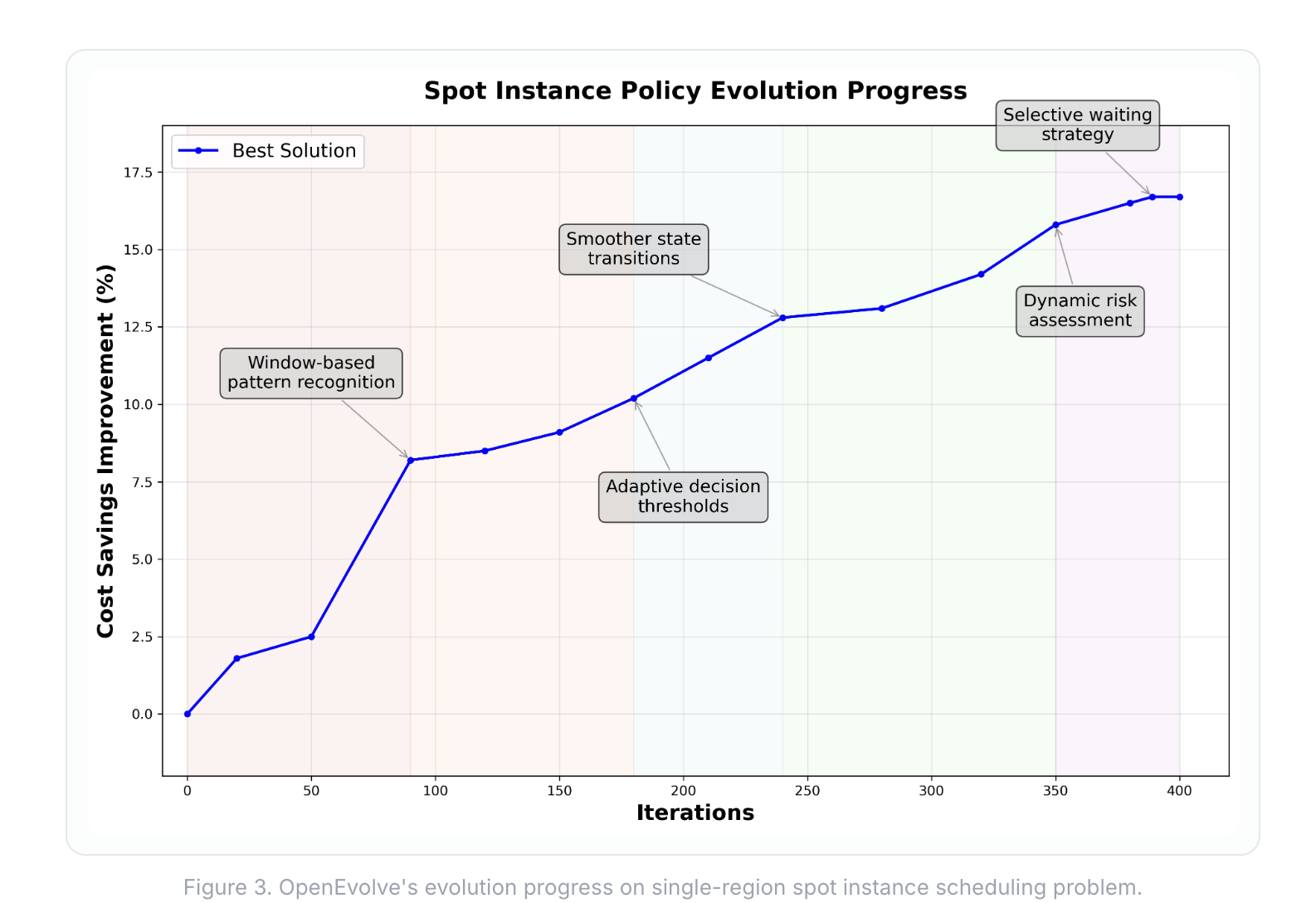 This post is the second in our ADRS series, where we apply AI to optimize complex system problems. Here, we tackle spot instance scheduling, a classic cost-versus-reliability problem in the cloud. We demonstrate how OpenEvolve discovers novel algorithms that surpass the algorithm from an NSDI'24 Best Paper, achieving up to 16% and 48% cost savings in single and multi-region setups, respectively.